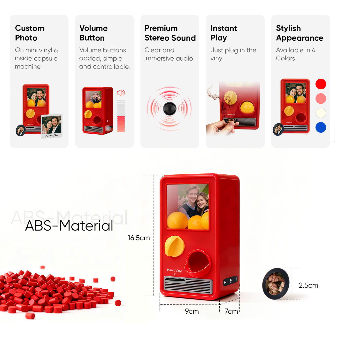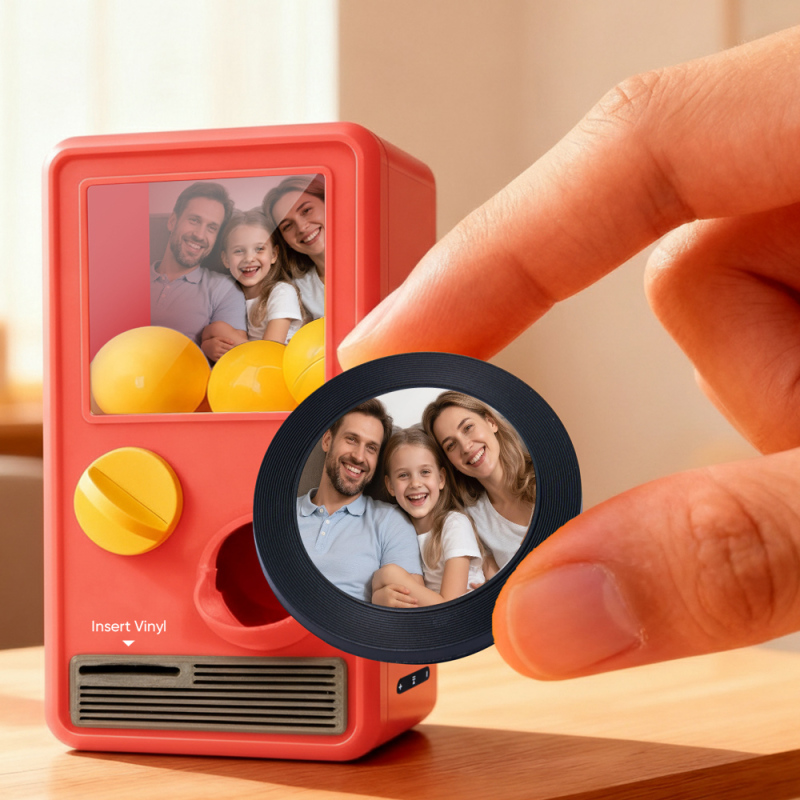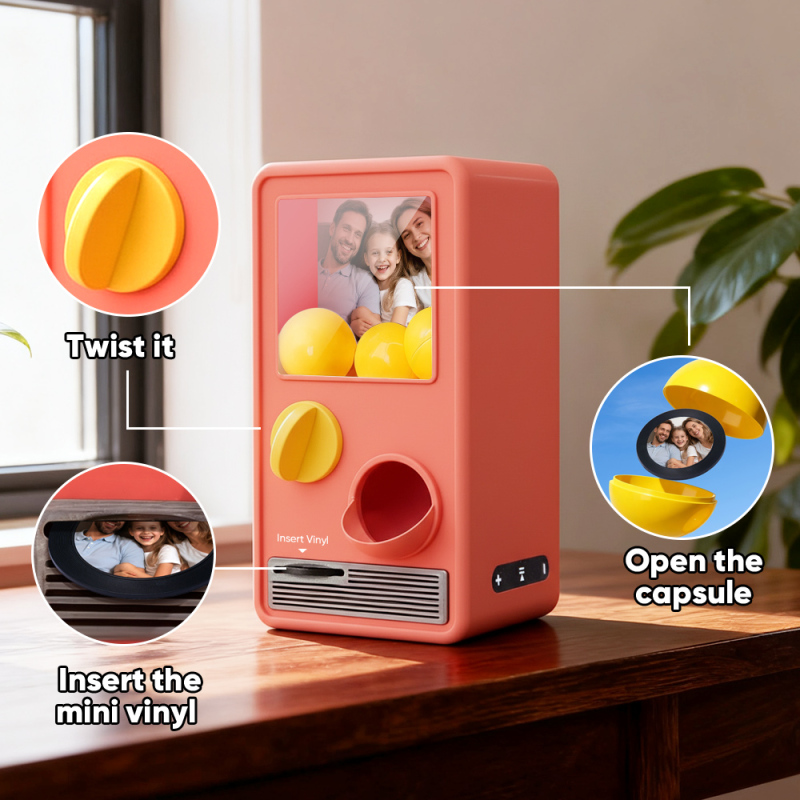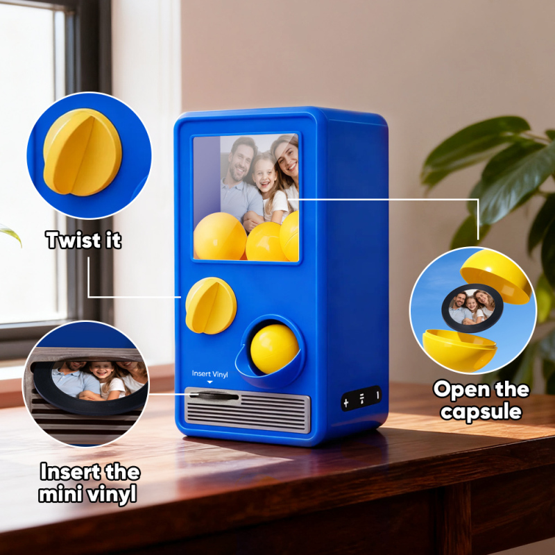 Discover the joy of music and surprise with our Music Gachapon Machine! Modeled after a classic toy capsule dispenser, this charming unit holds up to 7 gachapon balls—each containing a unique, customizable CD record inside. Personalize every disc with a special song and a photo that holds meaning, then let the machine bring your creations to life with instant playback.