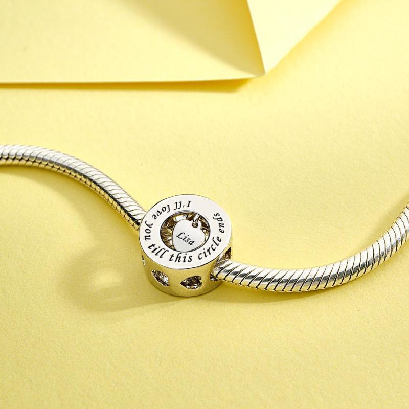 This "I'll Love you till this circle ends" Engravable Charm is a beautiful and romantic piece of jewelry that is perfect for expressing your love to someone special. The charm features a circular design with the phrase "I'll Love you till this circle ends" engraved on the edge, adding a sentimental touch to the design. The charm also includes a heart-shaped pendant in the center that can be customized with your own engraving, making it a truly unique and personalized gift.