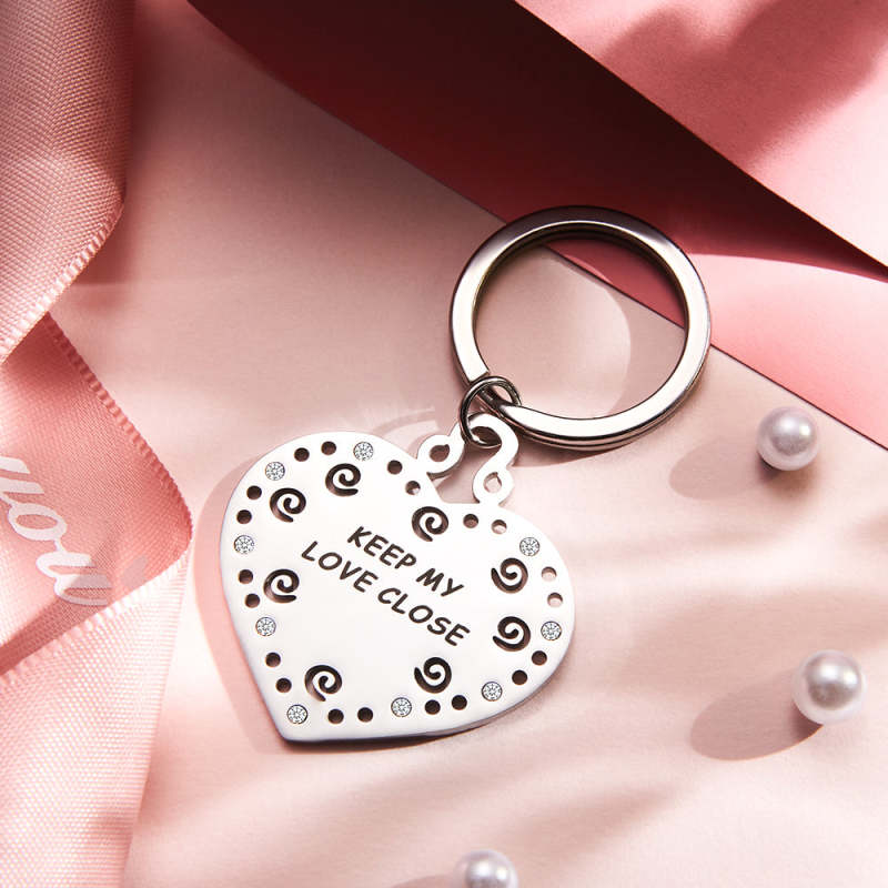 Personalized jewelry is a must for everyone. It is a lovely way to get decked out in a unique way that is literally customized for the wearer. Give her your heart to take with her everywhere she goes with our personalized keychain. This heart-shaped silver key chain features delicate symbol designs around its border accented with small crystals. Engrave the key chain with her name, birthday, or loving message just for her.