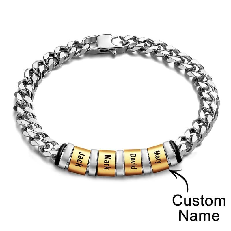 This Custom Engraved Name Bracelet is handmade from stainless steel and plated in either silver or gold. It features a minimalist design with a custom engraved name or phrase of your choice. Whether you're looking for a Mother's Day, Father's Day, or birthday gift, this bracelet is the perfect way to show your loved ones you care.