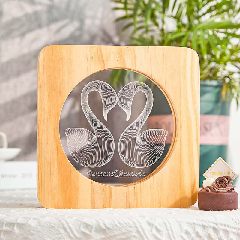 Custom Engraved Night Light Swan Wood Frame Couple Gifts