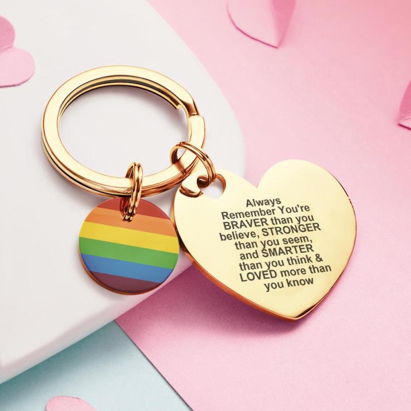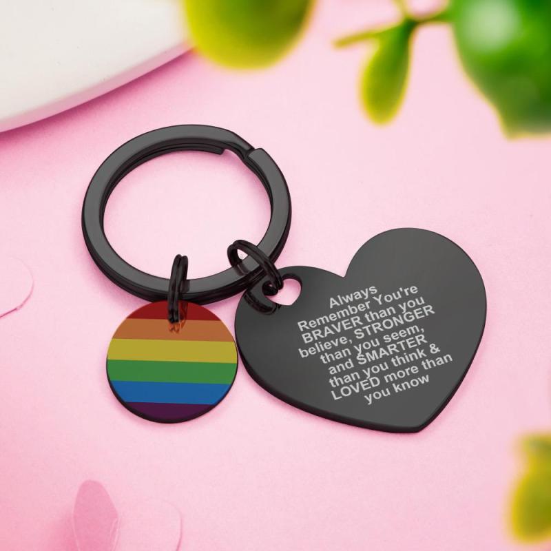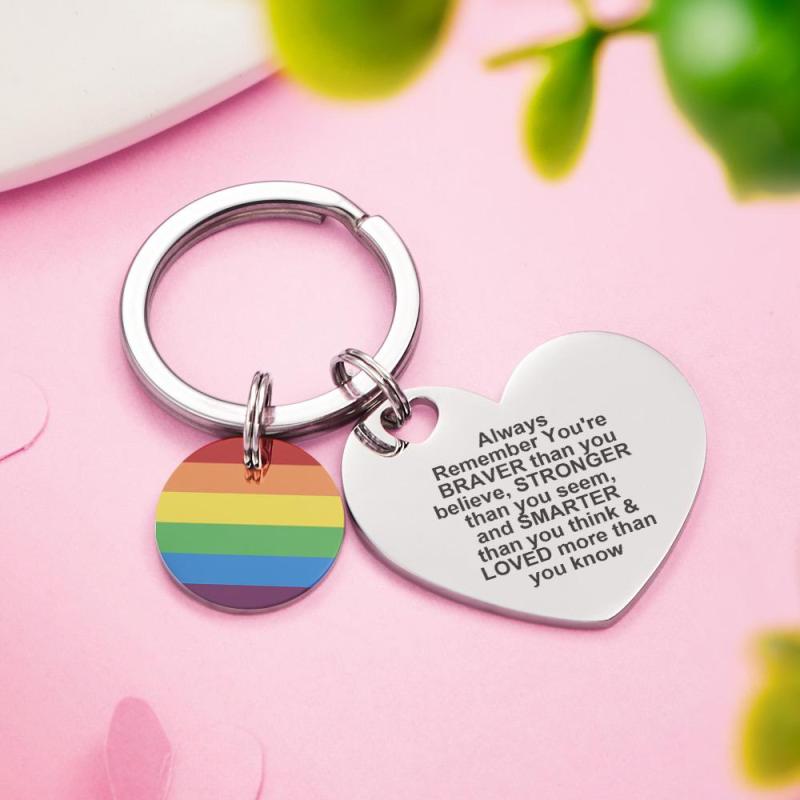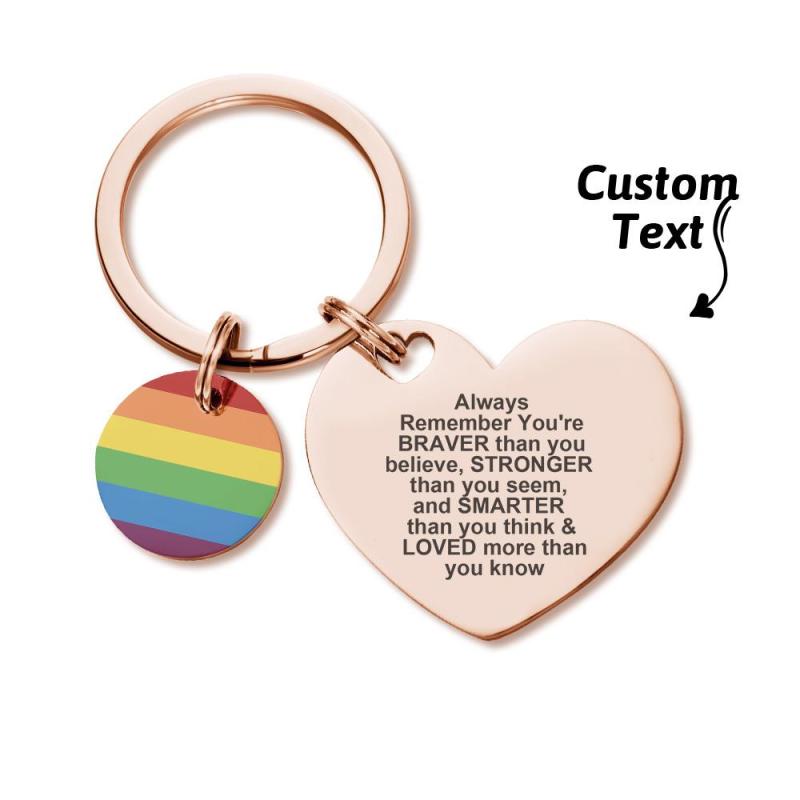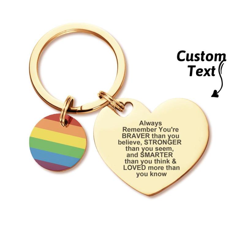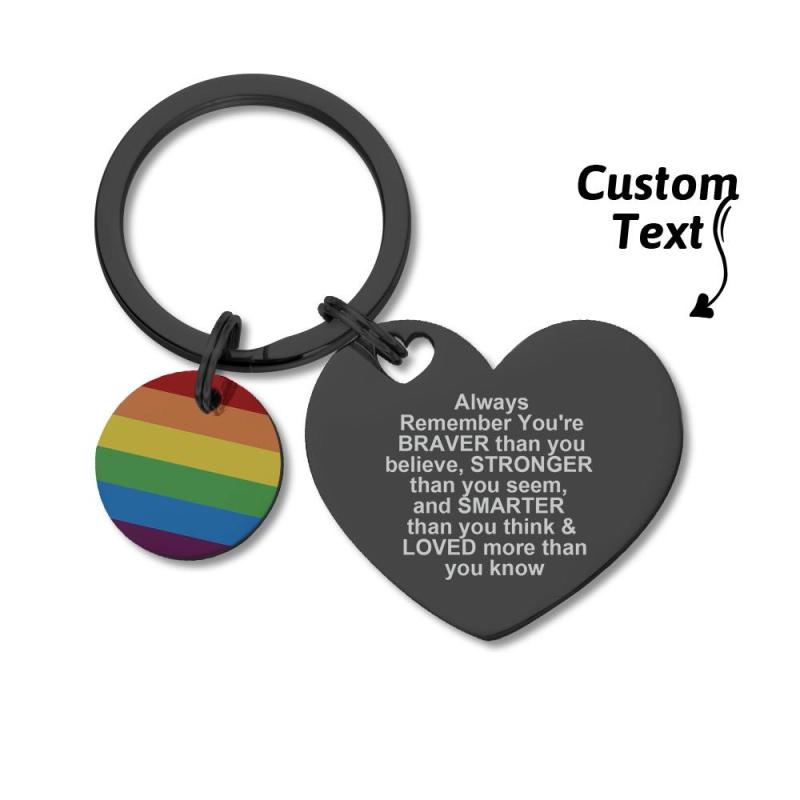Show your pride with this personalized engraved LGBT Rainbow keychain. Crafted with durable metal and featuring a colorful rainbow design, this keychain is ideal for customizing with your own special text. A perfect custom gift for any LGBT or Pansexual occasion.
