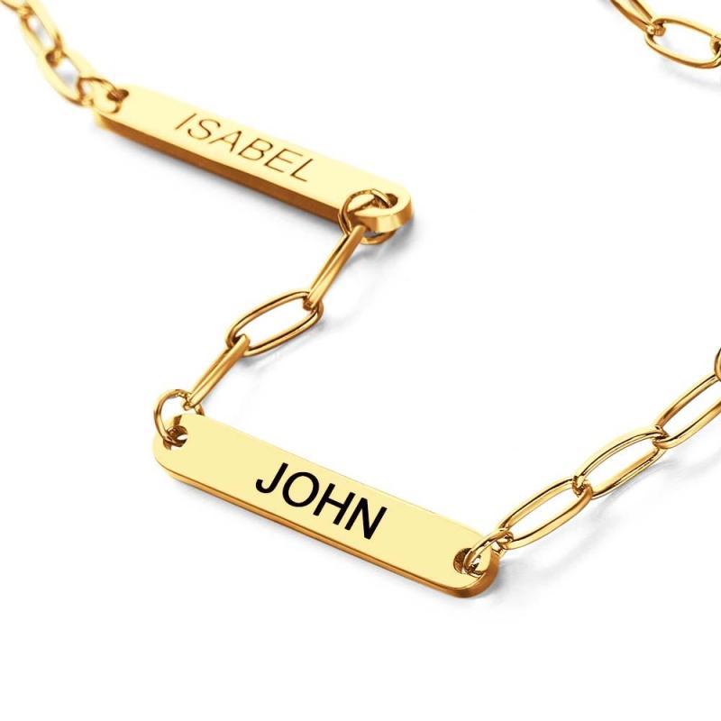 Personalize this bar bracelet with any names or words that are special to you. The paperclip bracelet chain can be accented with multiple charms to create the perfect customized gift.