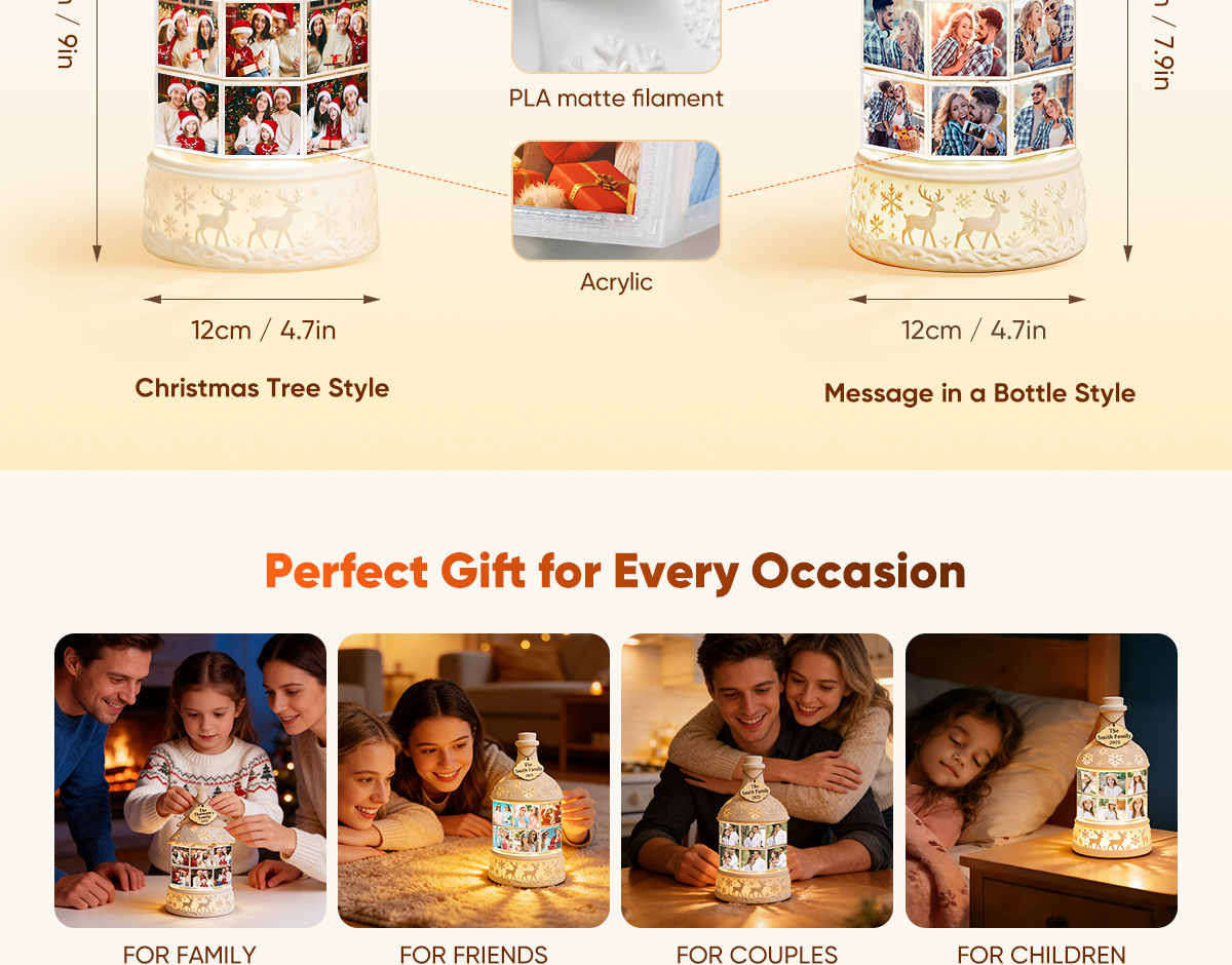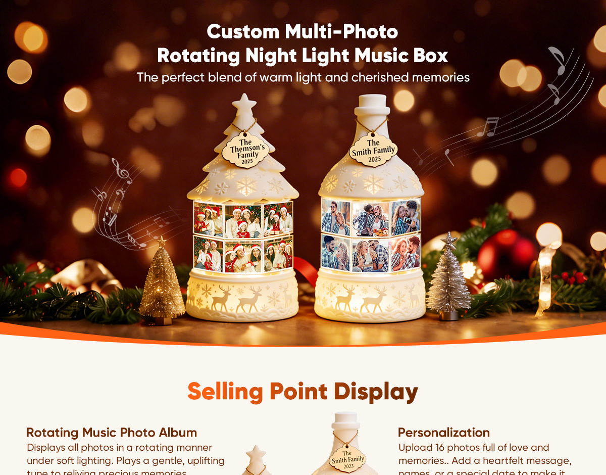 Illuminate your holidays with a personal touch. Our Custom Multi-Photo Rotating Night Light Music Box combines warm, cozy lighting with cherished memories. This unique night light rotates through up to 16 uploaded photos, turning your favorite moments into a gentle, moving slideshow that glows softly in any room.
