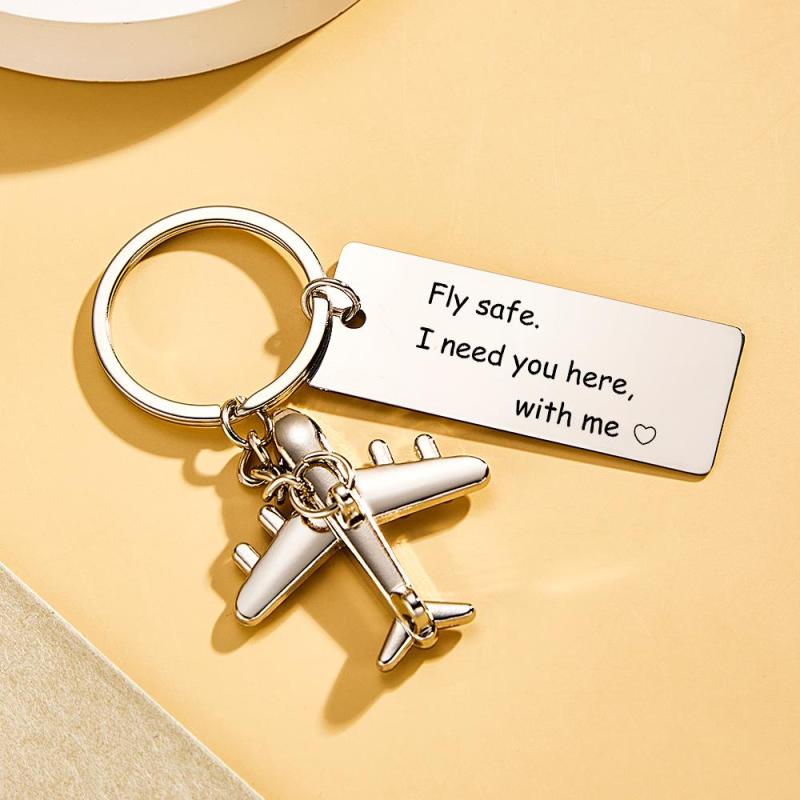 Personalized Fly Safe I Need You Here with Me Engraved Keychain with Airplane Charm, Gift For Pilot Flight Attendant Aviation Crew Frequent Traveller Fly safe I need you here with me, with plane charm.