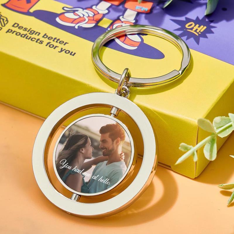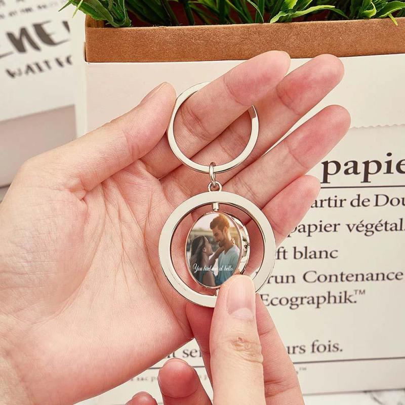 Are you looking for the perfect Valentine's Day gift? Customize our rotatable round metal keychain, designed to celebrate love. Choose a photo or sweet moment of yours and match it with personalized text to create a unique souvenir.