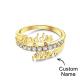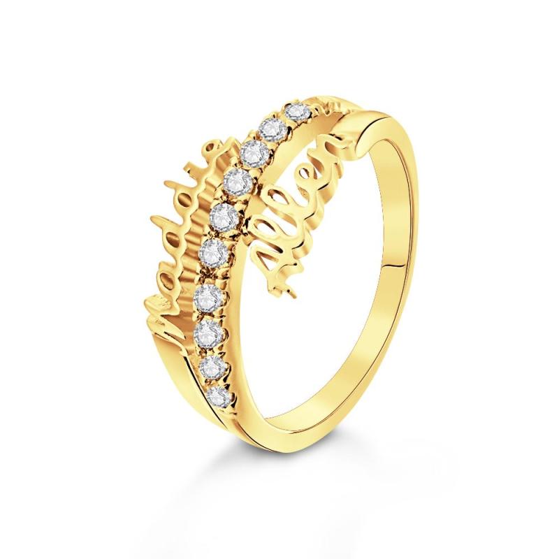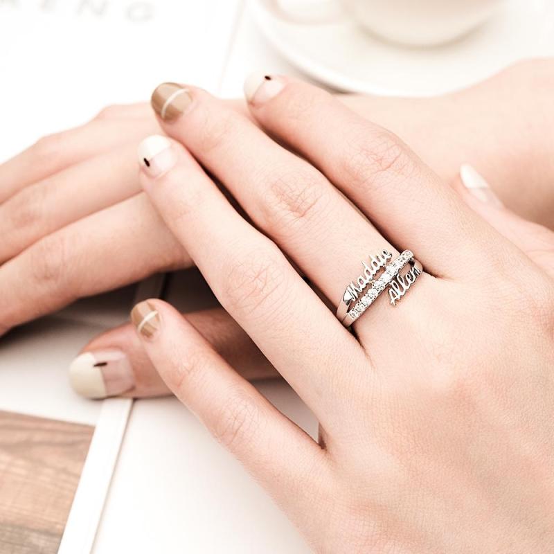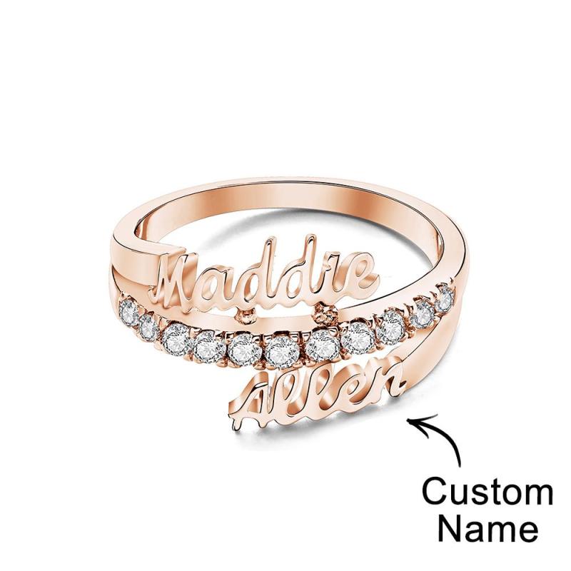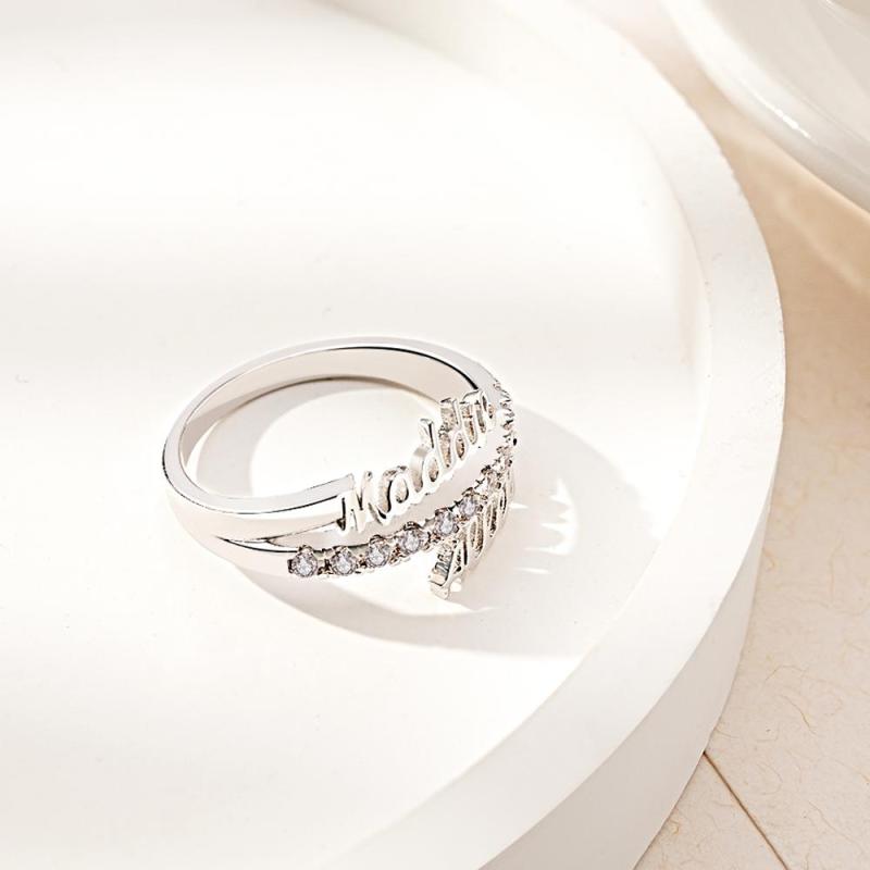 This striking double name ring is the perfect gift for couples, mothers, and daughters. Crafted from gold and silver, it comes in three color plated options to ensure the perfect fit. Ring size is adjustable from US 7-13. Show your special someone how much they mean to you with this special piece of jewelry.