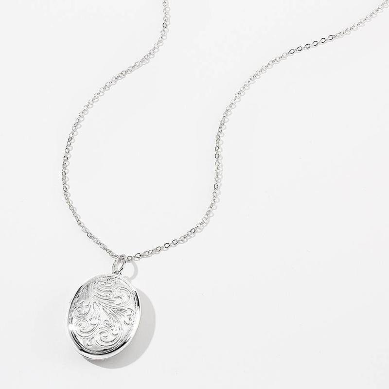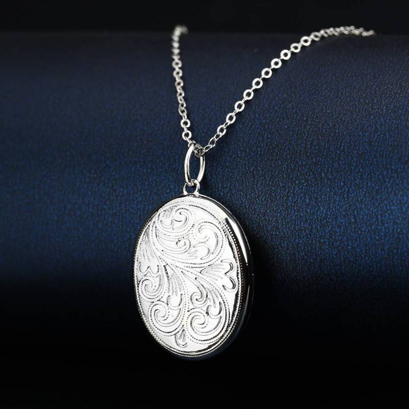 Embossed Oval Photo Locket Necklace with Engraving Platinum Plated