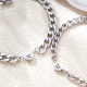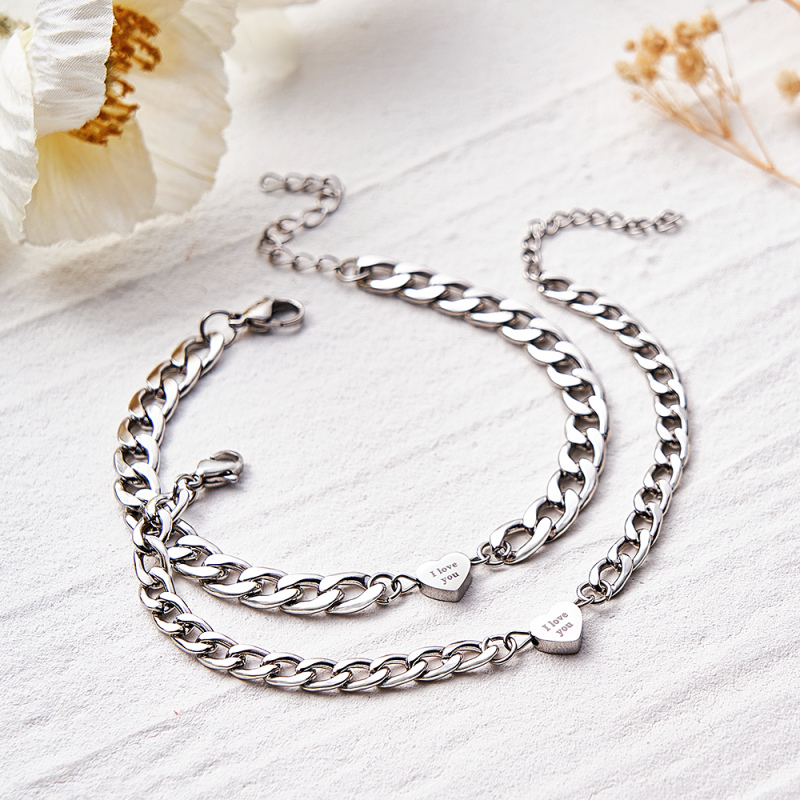The design of this bracelet is inspired by the romantic heart-shaped pendant. Short text can be customized on the heart-shaped pendant in the middle to record your precious memories. The chain is adjustable to fit wrists of different sizes, giving you and your partner a perfect fit.