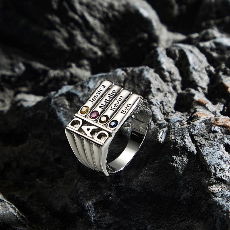 This personalized Father's Ring is crafted from strong and durable stainless steel with four birthstones of your choice. It is engraved with your family's names for a unique and meaningful gift on dad's birthday. Ideal for any dad who loves a personalized touch.