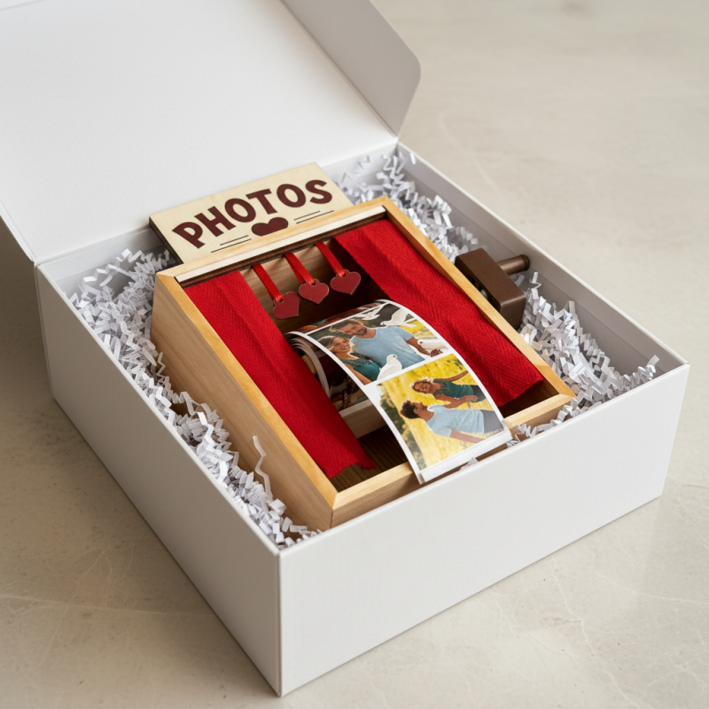 This wooden photo booth box features a simple manual scroll design that lets you turn the side knob to smoothly reveal or rewind your photo strip. Inspired by classic photo booths, it transforms your favorite moments into a charming, interactive display.