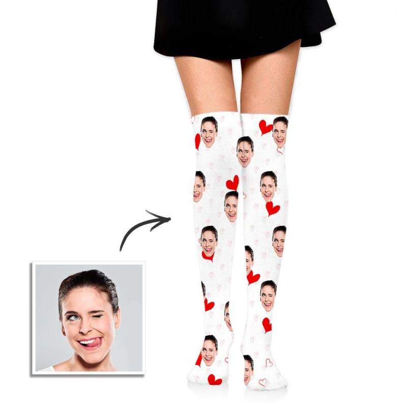 Custom Face Socks, Personalized Knee High Printed Picture Adult Tube Face Socks with Red Hearts