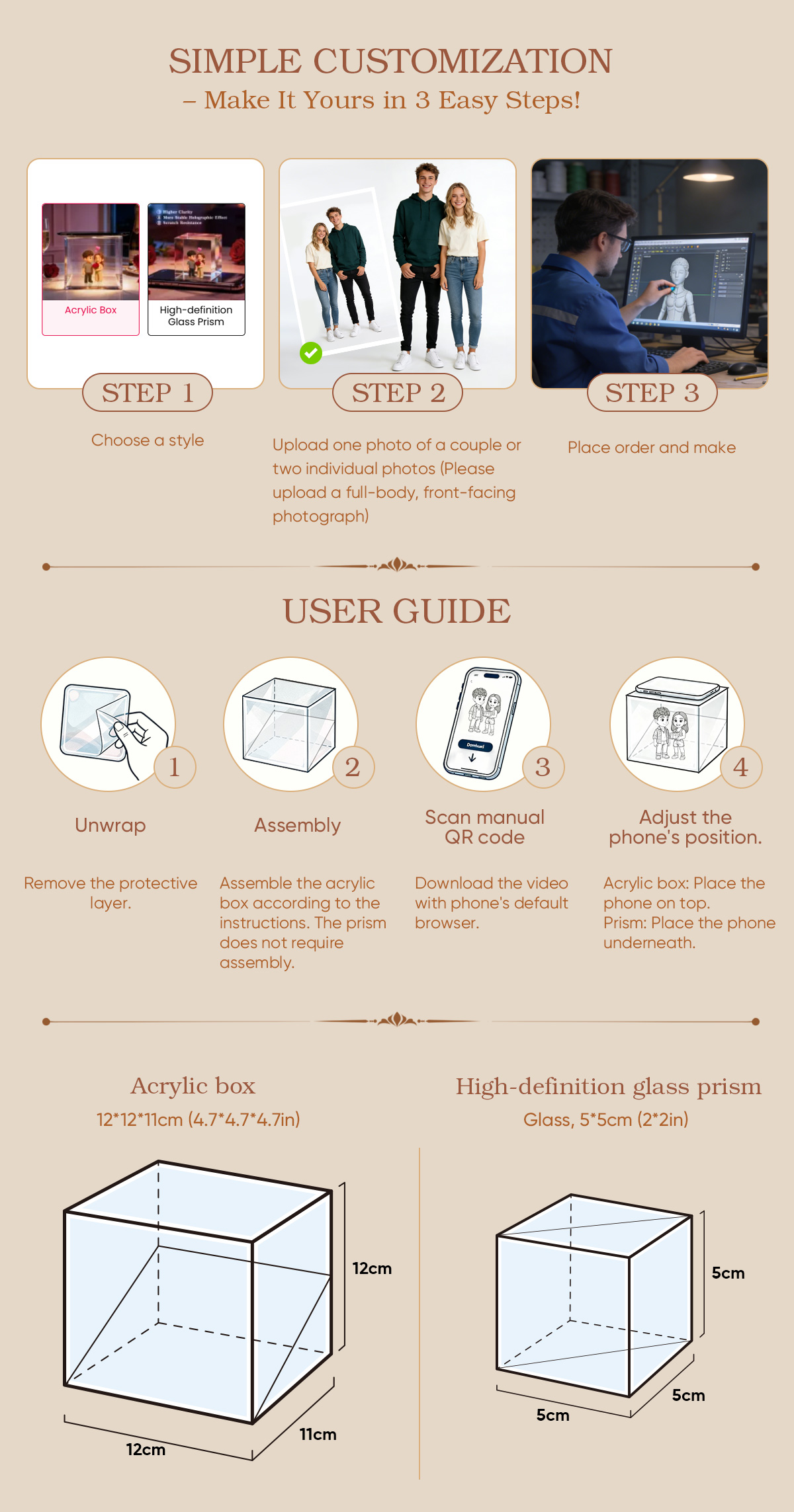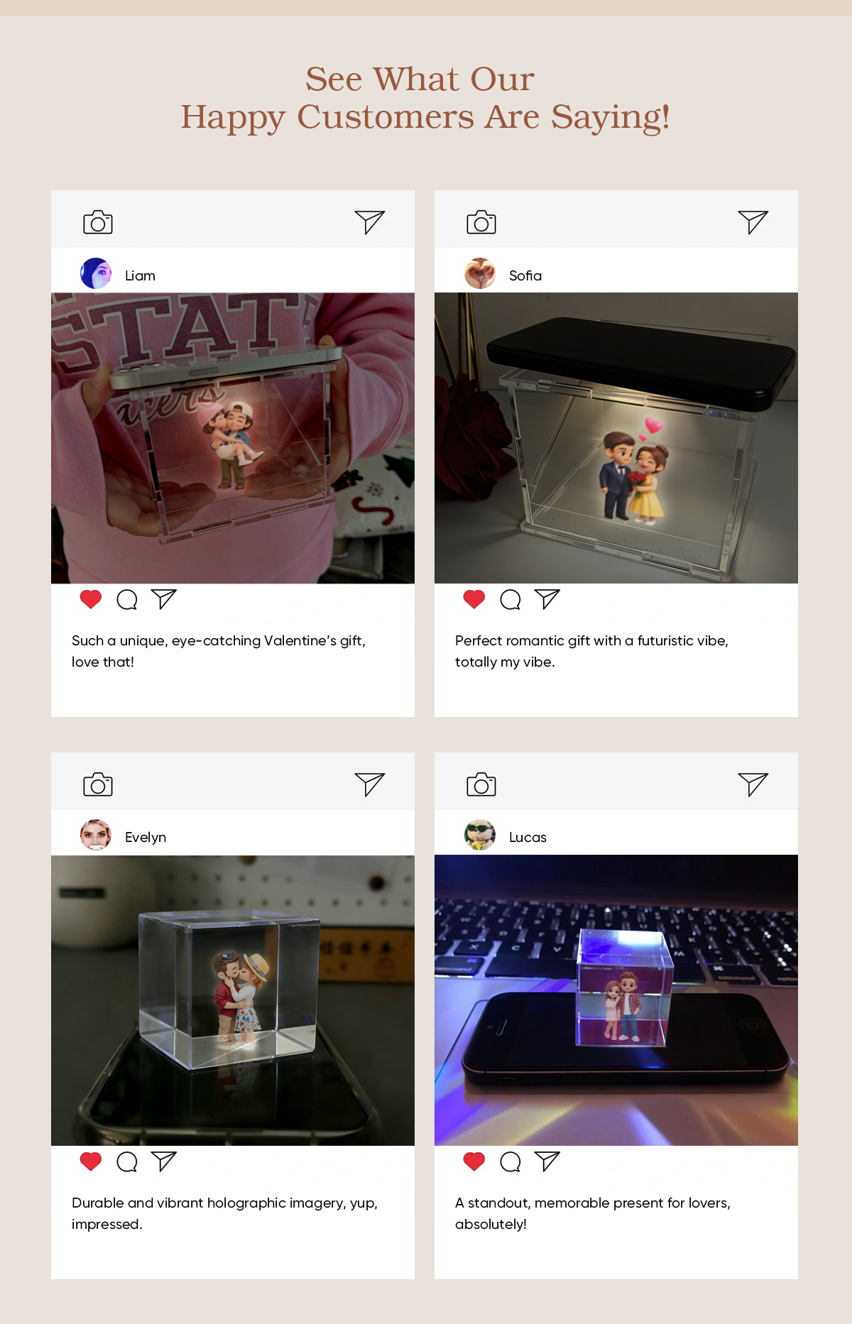 Upload your photos to obtain a unique 3D holographic effect that faithfully reflects your story in every detail.