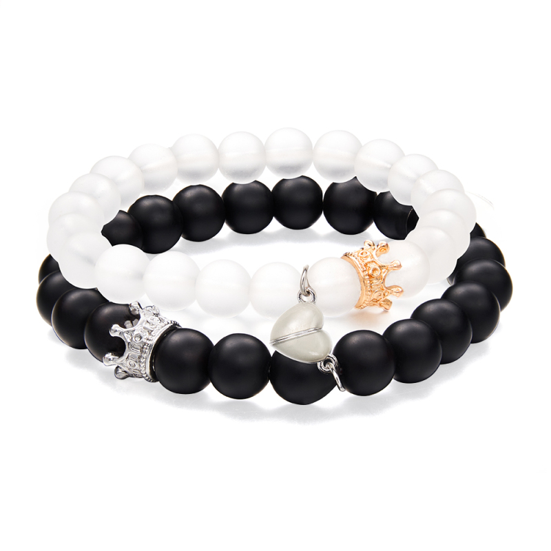 Luminous love heart magnetic pendant will show mutual attraction when close. This couple's bracelet symbolizes everlasting love and friendship between lovers or friends. The heart-shaped part is luminous and emits blue light in dark places. This couple's heart-shaped crown bracelet is made of round frosted glass beads threaded together. The threading is elastic, allowing the bracelet to fit perfectly with the wearer. Easy to match. Perfect for any occasion.