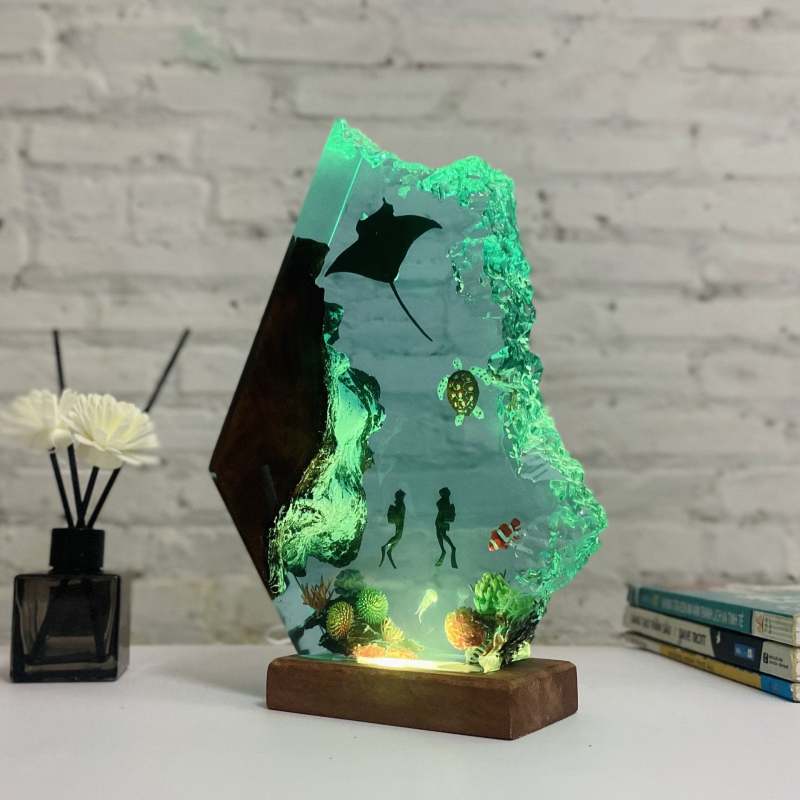 Immerse yourself in the underwater world with our stunning Manta Ray and Couple Epoxy Lamp. Handcrafted with wood and resin, this unique night light features Multicolor LED lighting. Includes: