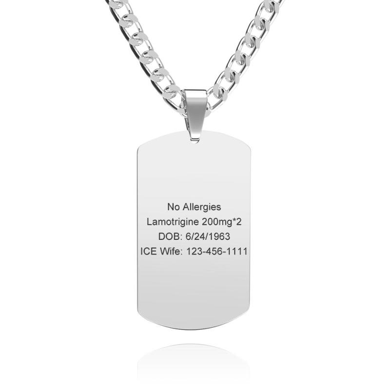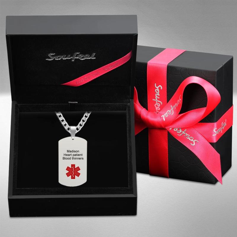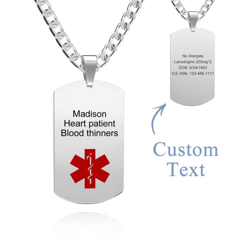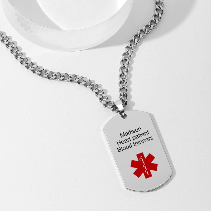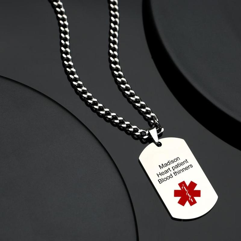 This is a medical alert necklace for the elderly and family members with acute diseases. The pattern on it is the first aid symbol, which is convenient for medical staff to quickly find the disease and treat it quickly when an accident occurs to family members with chronic diseases.