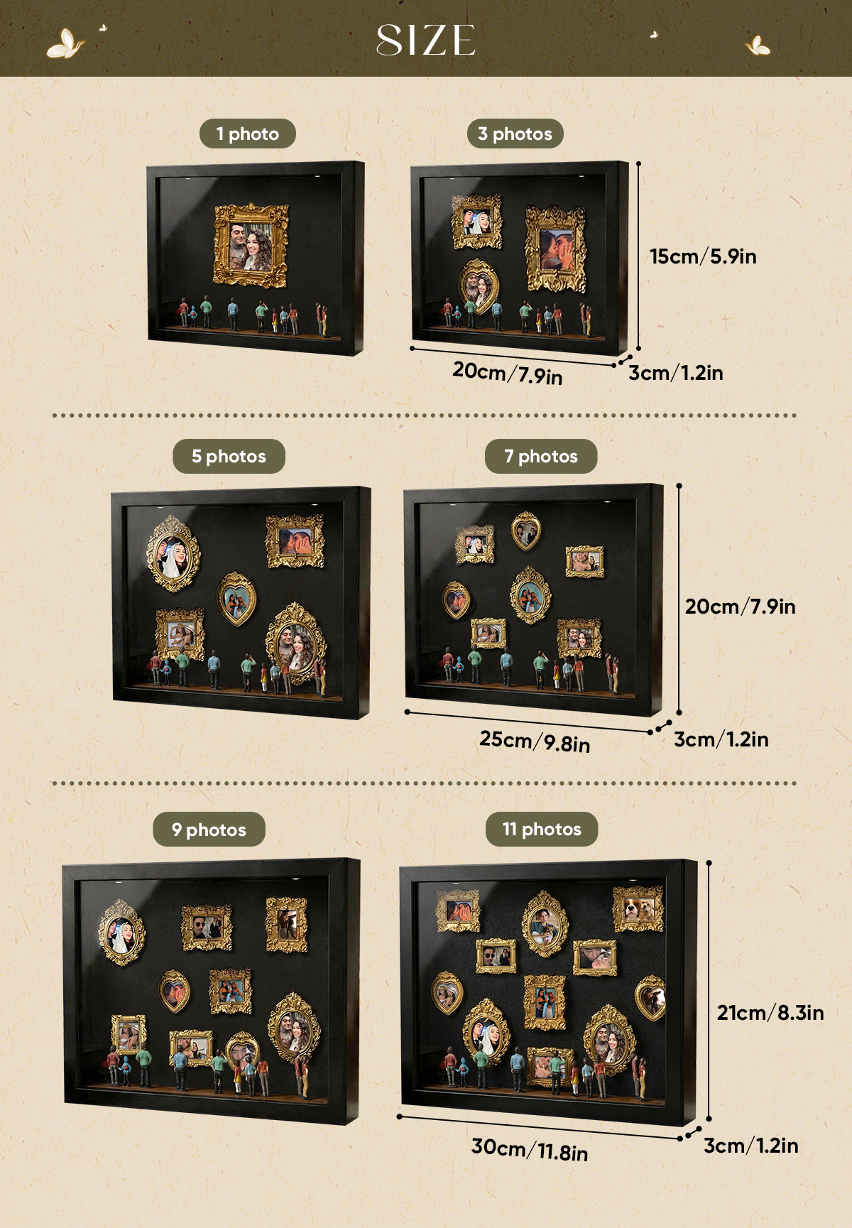 5-photo & 7-photo version: 20 × 25 × 3 cm (7.9 × 9.8 × 1.2 in)