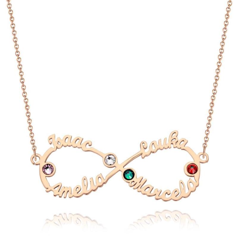 Name Necklace with Birthstone Infinity Necklace Four Names Four Birthstones Rose Gold Plated - Silver