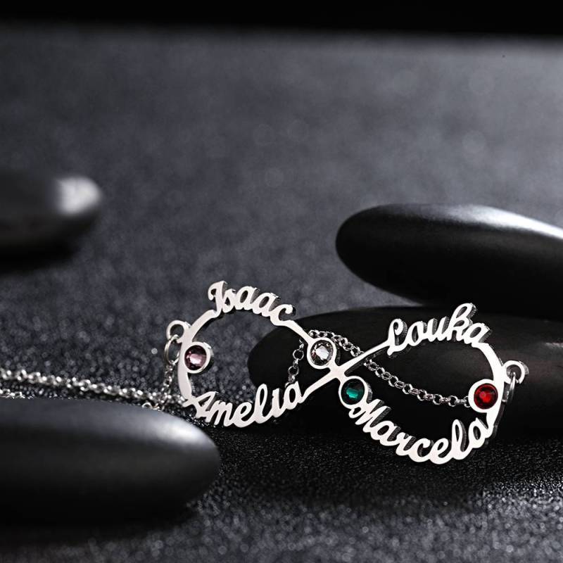 Name Necklace with Birthstone Infinity Necklace Four Names Four Birthstones Silver