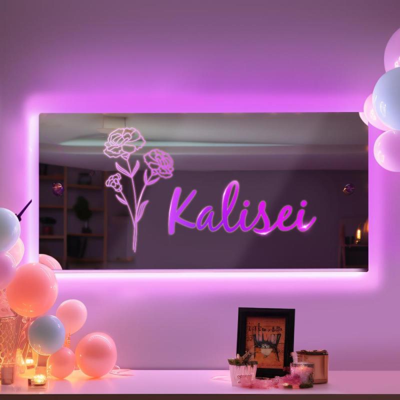 What’s in the box:Personalised name mirror with LED lighting, made from lightweight, shatterproof acrylic. Includes remote control and wall mounting stand-offs.