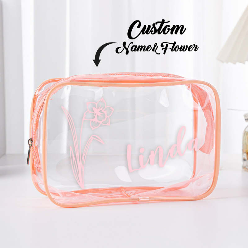 Personalized Birth Flower Name Clear Makeup Bag Birthday Wedding Travel Gift for Her