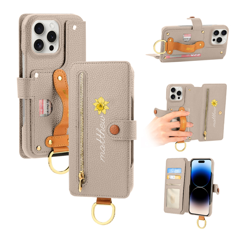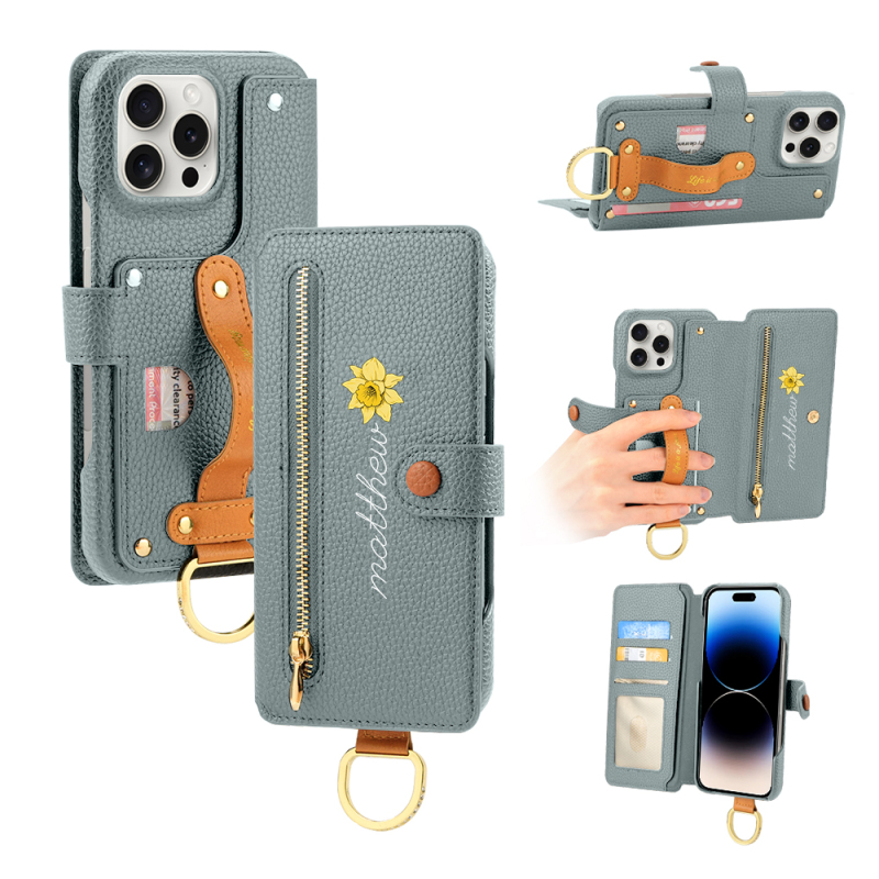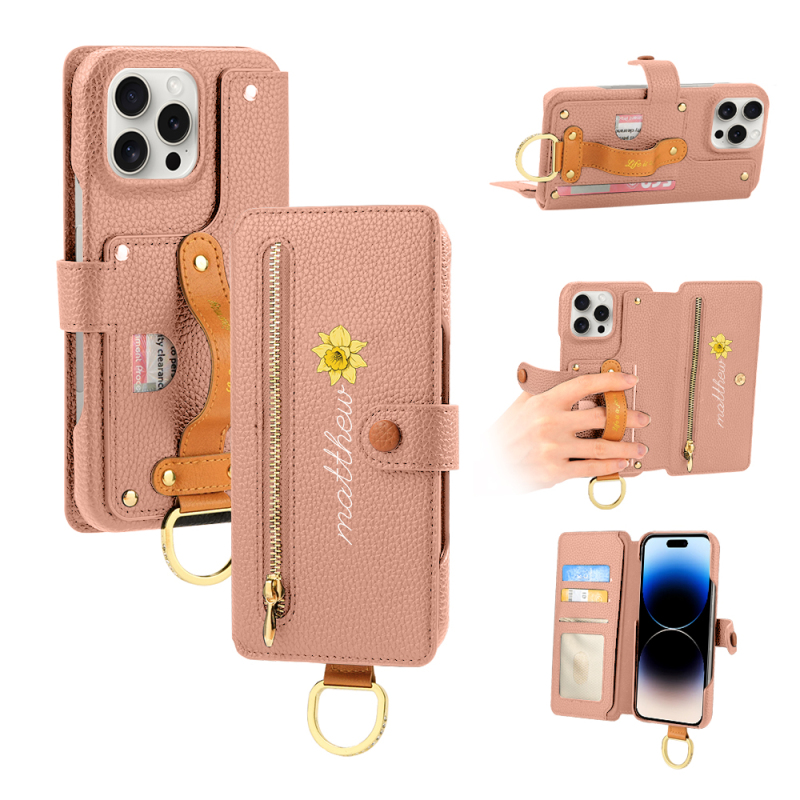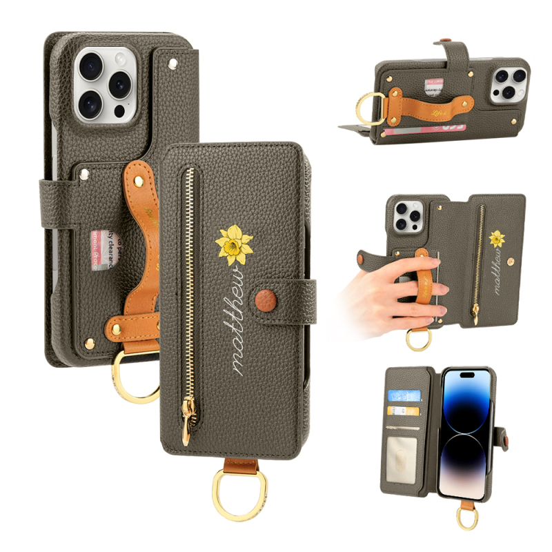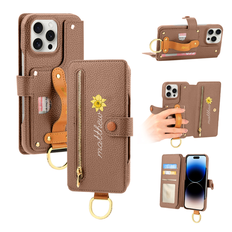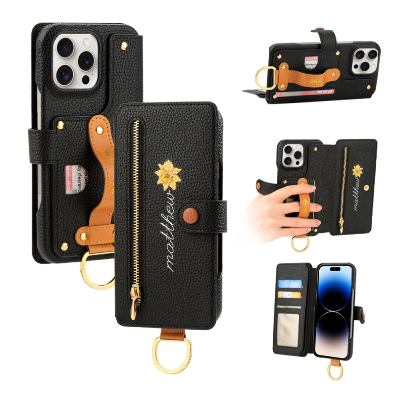 Personalized Birth Flower Name Leather Flip Wallet Phone Case with Card Holder