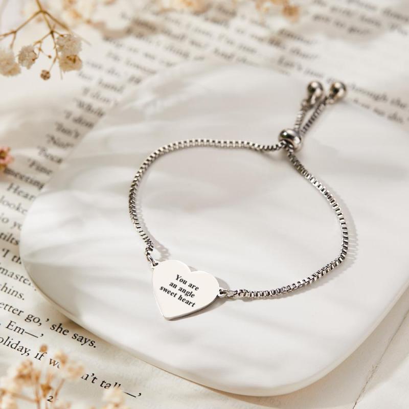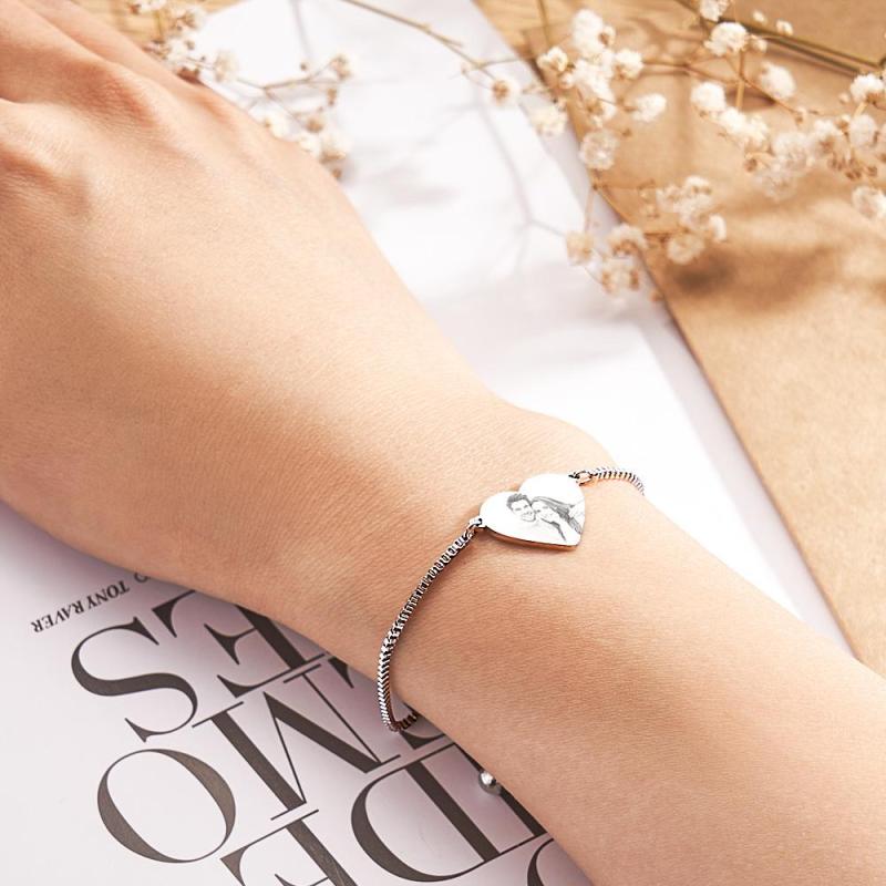 Personalized Custom Photo Text Stainless Steel Adjustable Bracelet Carved Heart Shaped Pendant Fashion Jewelry Custom Gift for Women