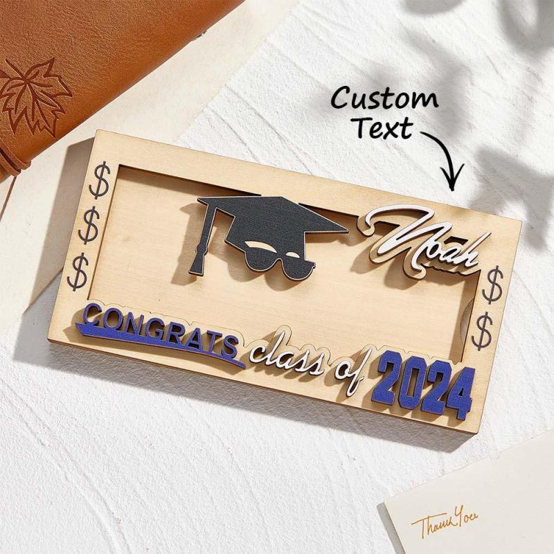 Celebrate the Class of 2024 with a unique Personalized Name Laser-Cut Graduation Wooden Cash Holder. It features a sleek design with a custom-printed bachelor's hat, and the graduate's name and year for a special touch. Made with reliable, lightweight wood, this modern money clip is a thoughtful alternative to traditional graduation cards.