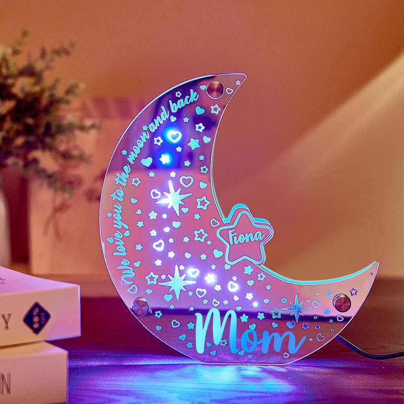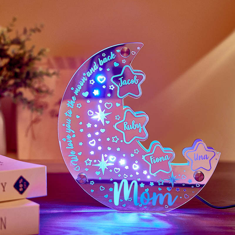 This personalized moon mirror light is the perfect gift for moms! Customize it with a family member's name for a unique touch. The LED lights create a warm and comforting ambiance in any room. Celebrate mom in style with this thoughtful and one-of-a-kind gift.