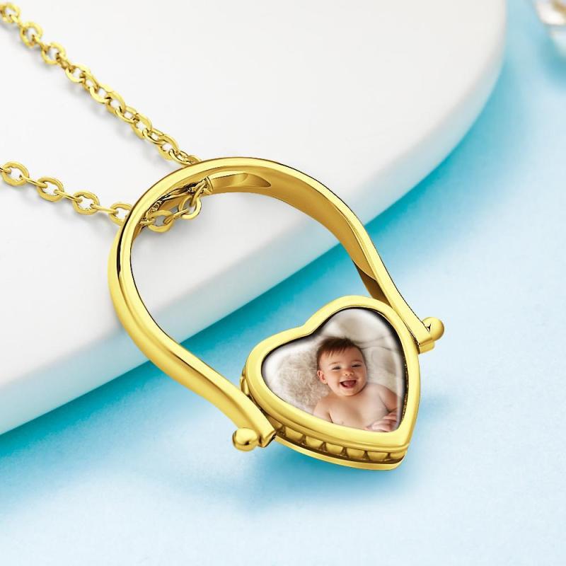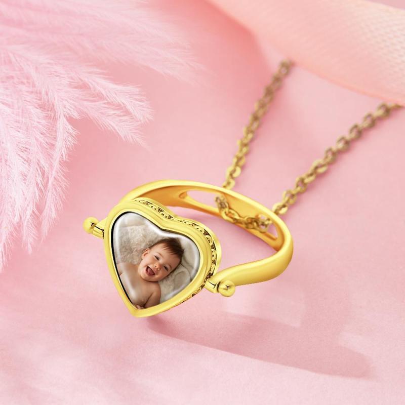 Photo Necklace, Photo Ring Couple's Gifts Dual-use (Ring Size 8#) 14k Gold Plated Silver