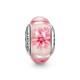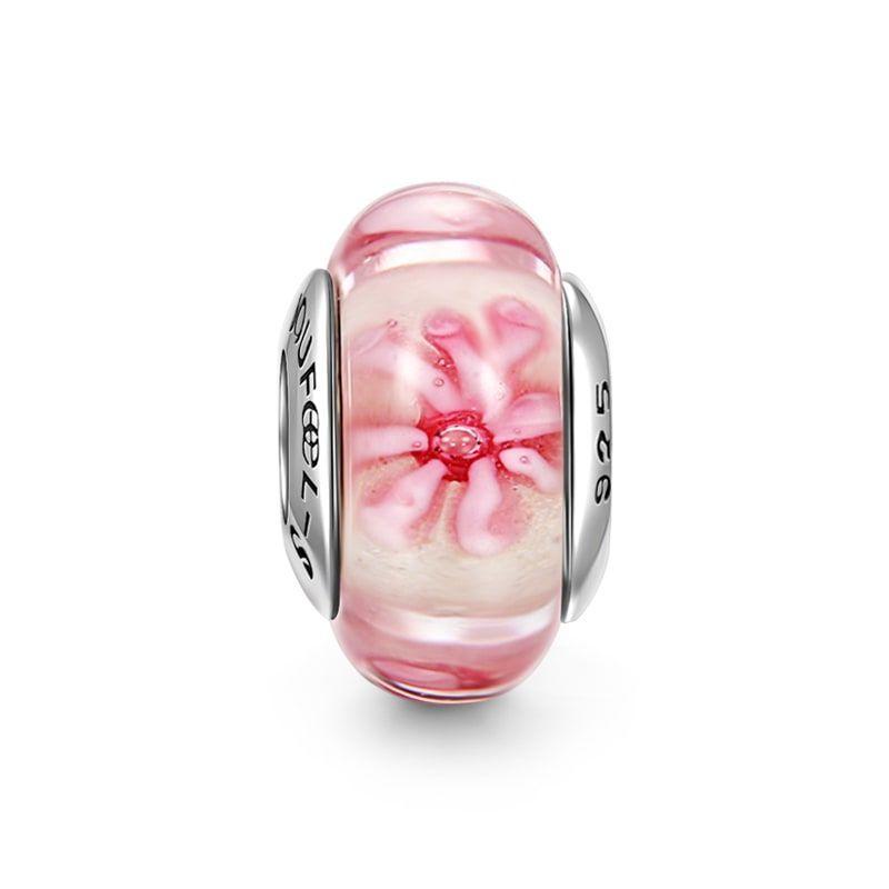 Pink Flower Murano Glass Charm: This bead will charm you into stopping to appreciate the sheer beauty of nature with its lovely flowers with stunning swirls in the centers. Encased in a setting of soft, subtle stripes between each bloom, in both light and dark pink hues the flowers depicted in this Murano Glass Bead will simply take your breath away, letting you appreciate the allure of fresh blossoms wherever you are. The artistry of these blooms captivates, whisks one away to memories of fresh air and fragrant blooms even when indoors. Give into the allure of the feminine beauty of pink in Murano Glass, creating a charm with unrivaled appeal to any nature or flower lover. Add this glass bead to your bracelet and you too shall bloom, your life will become another miracle of nature. Be transcended by the efflorescence of these soft flowers.