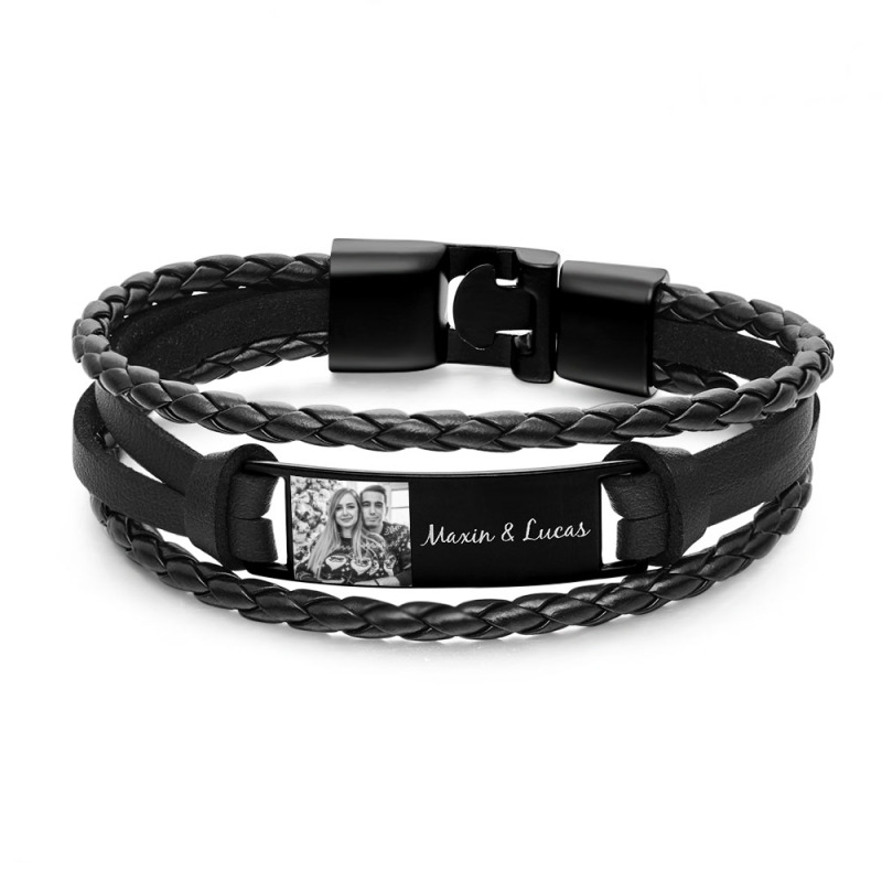 Customizable Masculine Classic Jewelry Gifts for Men.Fashionable Leather Clean Minimalist Man Bracelet with Engraving. The perfect gift for dad father son boyfriend husband. Surprise your loved ones with a great gift for his birthday Christmas Father's Day or any other occasions.Made of high-end black leather, stainless steel clasp and silver metal plate.Exquisitely printed pictures and carefully carved text give your loved one a long-lasting touch.