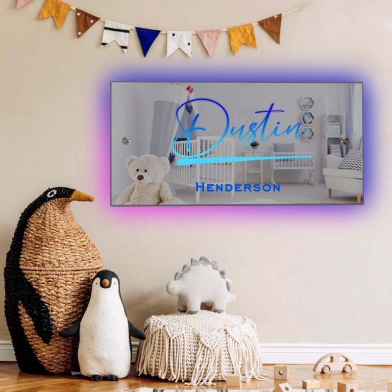What’s in the box:Personalised name mirror with LED lighting, made from lightweight, shatterproof acrylic. Includes remote control and wall mounting stand-offs.