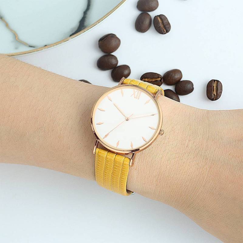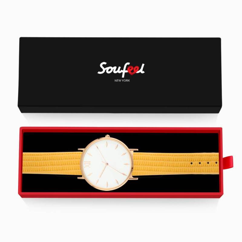 Soufeel adopts the watch movements manufactured by world's leading movement manufacturer Ronda in Switzerland and Citizen in Japan, you will enjoy the precise time as you wish. Daily life water resistant. It is a true designer statement and the perfect watch for any occasions. This watch has a simple and unique design, with a slim case, you can easily match any type of accessories to it. This classic timepiece is a perfect gift for you or your friends in a sleek and luxurious way. Soufeel has a ton of customized jewelry options that are reasonably priced and make for great gifts for all sorts of occasions like birthdays, holidays, anniversaries. It's great for layering, a wonderful minimalist piece, perfect gift for your wife, girlfriend, husband, boyfriend or simply to treat yourself! Simply Style Dial Watch Yellow Leather Strap - Women's.
