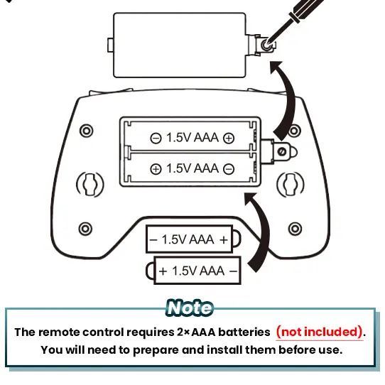 Note: The remote control requires 2xAAA batteries (not included). You will need to prepare and install them before use.